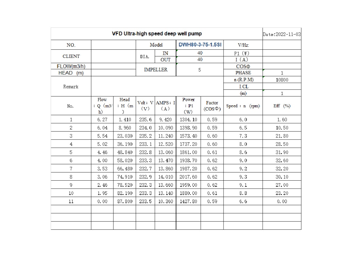 The borehole pump __ DWH80-3-75-1.5SI_______ is designed to pump clean liquids that do not contain solid particles or fibers. It is used to supply groundwater to water supply systems of private houses, small water supply stations, and irrigation systems.